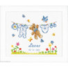 Vervaco, kit naissance bébé (art. PN0169612). Dimensions: 25 x 24 cm. Trame: Aïda 5.5 pts/cm blanc. Cotons roses fournis avec le kit.