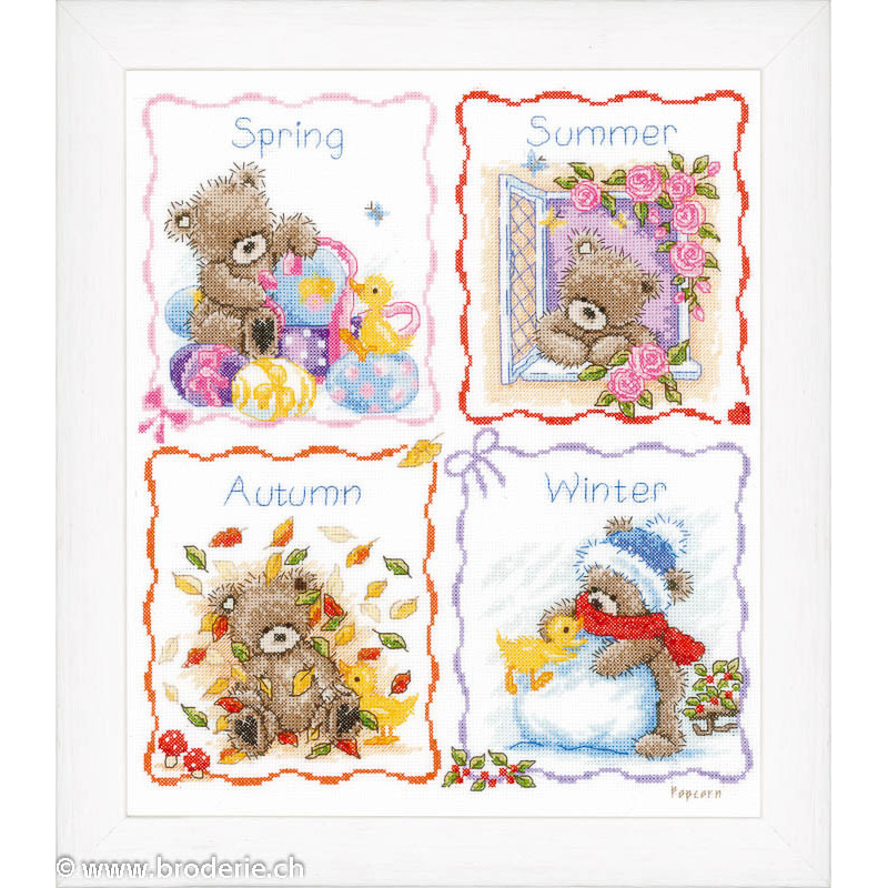 L'article 'Vervaco, kit Ours Popcorn quatre saisons (PN0148100)' fait partie de notre assortiment depuis le 17 juillet 2019. Vervaco est un fabricant belge de kits au point de croix, au point noué, aux points comptés, et propose aussi de sympathiques kits pour les enfants. Ils sont de réalisation relativement faciles : pas de quart de point, dessins et diagrammes très clairs, beaucoup de thèmes abordés (paysage , fleurs , mariage,et particulièrement kits de naissances, toises et Disney).