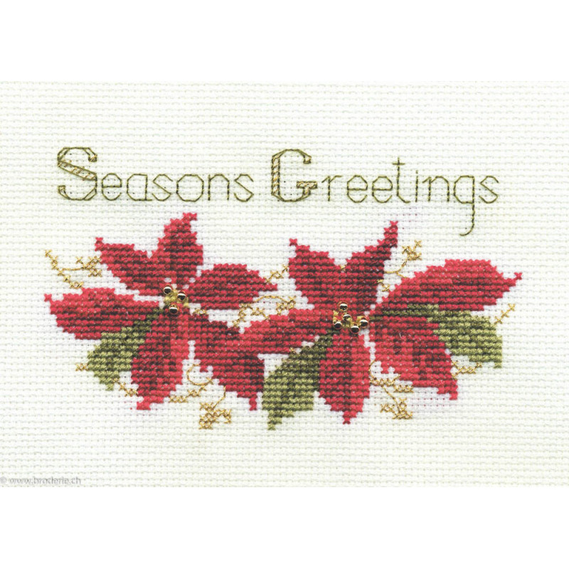 Derwentwater, kit Christmas Card - Poinsettias (art. DWCDX02). Dimensions: 13 x 9 cm. Trame: Aïda 6.4 pts. Points utilisés: point de croix. Kit carte de voeux, contient la carte et, l'enveloppe. Dans la même série DWCDX, pour les autres cartes de voeux, réf sous DWCDG et numéro.