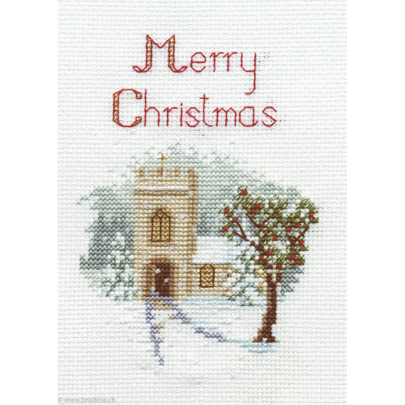 Derwentwater, kit Christmas Card - The Church (art. DWCDX04). Dimensions: 9 x 13 cm. Trame: Aïda 6.4 pts. Points utilisés: point de croix. Kit carte de voeux, contient la carte et, l'enveloppe. Dans la même série DWCDX, pour les autres cartes de voeux, réf sous DWCDG et numéro.