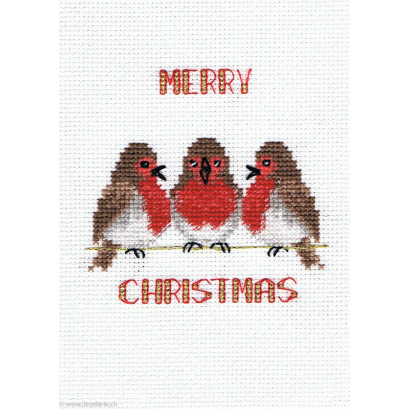 Derwentwater, kit Christmas Card - Robin Trio (art. DWCDX41). Dimensions: 9 x 13 cm. Trame: Aïda 6.4 pts. Points utilisés: point de croix. Kit carte de voeux, contient la carte et, l'enveloppe. Dans la même série DWCDX, pour les autres cartes de voeux, réf sous DWCDG et numéro.