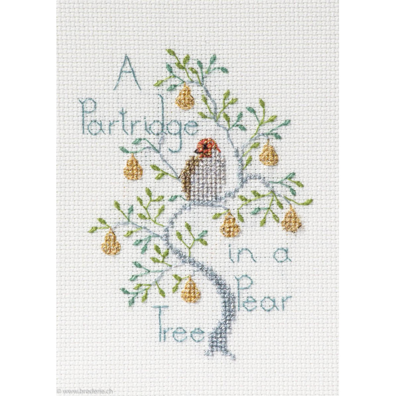 Derwentwater, kit Christmas Card - A Partridge In A Pear Tree (art. DWCDX52). Dimensions: 9 x 13 cm. Trame: Aïda 6.4 pts. Points utilisés: point de croix. Kit carte de voeux, contient la carte et, l'enveloppe. Dans la même série DWCDX, pour les autres cartes de voeux, réf sous DWCDG et numéro.
