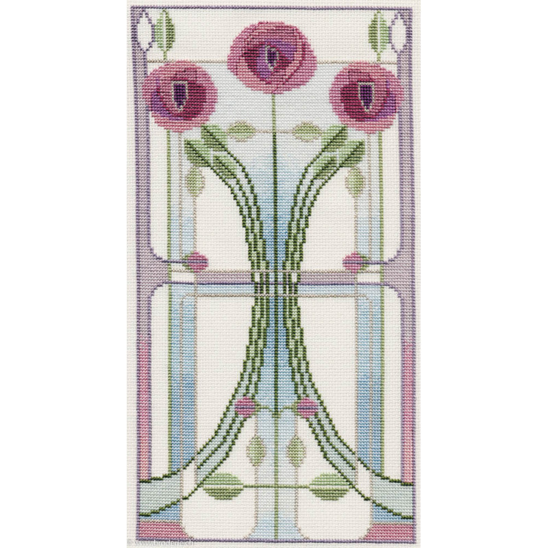 Bothy Threads, kit Mackintosh - Rose Bouquet (art. DWMKP1). Dimensions: 28 x 15 cm. Trame: Aïda 6.4 pts. Dans la même série DWMKP et numéro, modèle créé par Rose Swalwell à partir d'eouvres de Margaret Macdonald et Charles Rennie Mackintosh, contient parfois des fils métallisés.