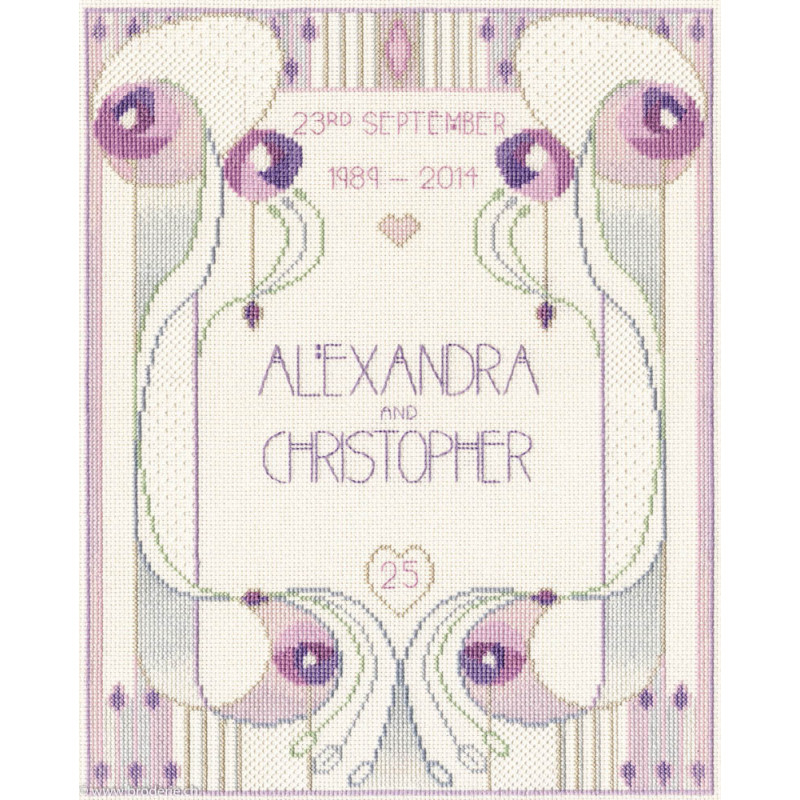 Bothy Threads, kit Mackintosh - Wedding / Anniversary Sampler (art. DWMKP4). Dimensions: 28 x 22 cm. Trame: Aïda 6.4 pts. Dans la même série DWMKP et numéro, modèle créé par Rose Swalwell à partir d'eouvres de Margaret Macdonald et Charles Rennie Mackintosh, contient parfois des fils métallisés.