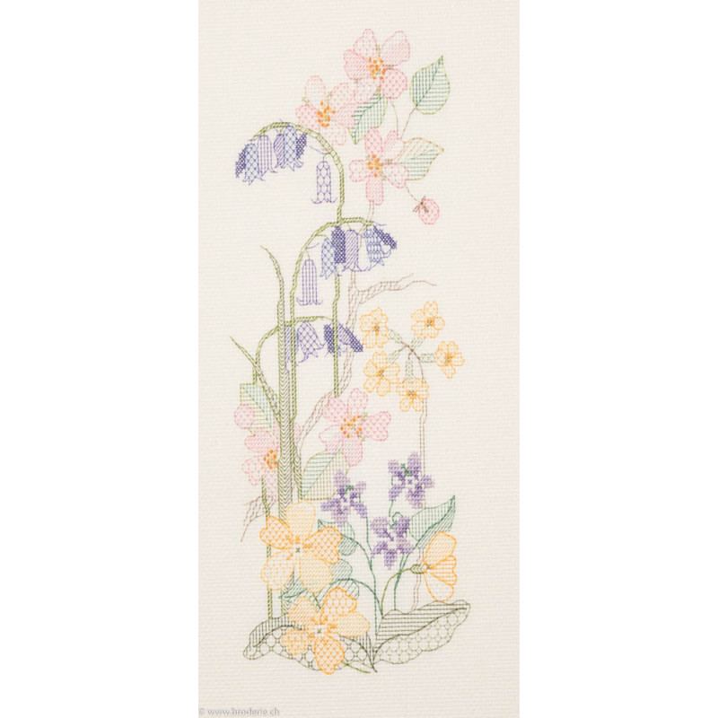 Derwentwater, kit Seasons Panels - Spring (art. DWSP01). Dimensions: 13 x 29 cm. Trame: Aïda 5.5 pts. Points utilisés: point de piqûre. Dans la même série DWSP 02, 03, 04 pour les autres saisons. Points arrières,backstiches.