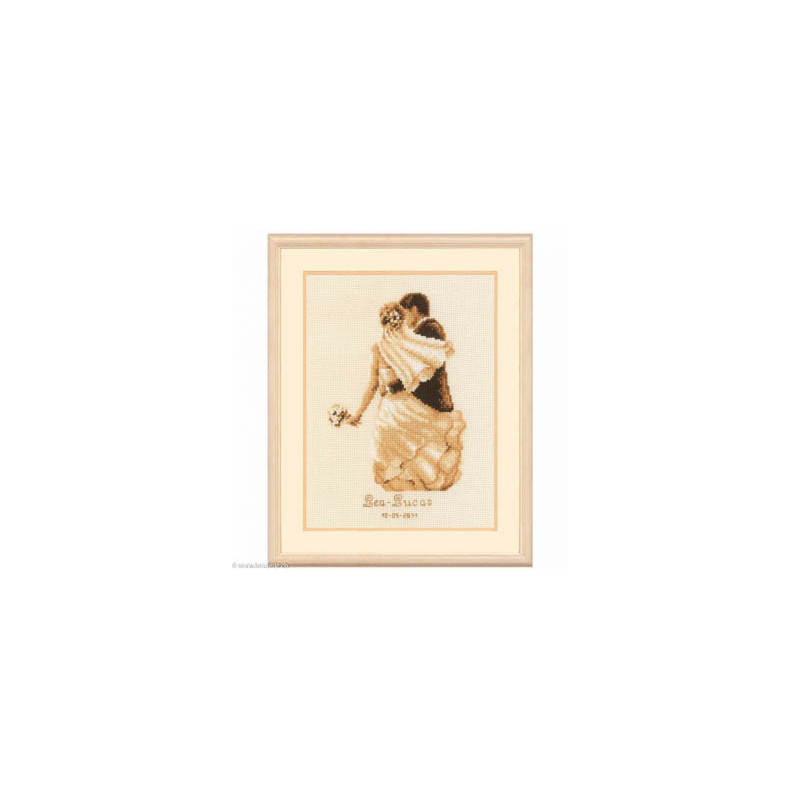 L'article 'Vervaco, kit des jeunes mariés (PN0012157)' fait partie de notre assortiment depuis le 22 juillet 2019. Vervaco est un fabricant belge de kits au point de croix, au point noué, aux points comptés, et propose aussi de sympathiques kits pour les enfants. Ils sont de réalisation relativement faciles : pas de quart de point, dessins et diagrammes très clairs, beaucoup de thèmes abordés (paysage , fleurs , mariage,et particulièrement kits de naissances, toises et Disney).