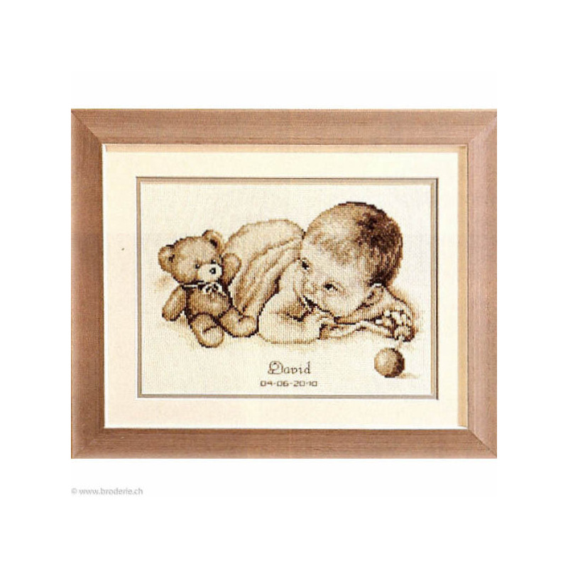 L'article 'Vervaco, kit un petit garçon avec ours (PN0012148)' fait partie de notre assortiment depuis le 22 juillet 2019. Vervaco est un fabricant belge de kits au point de croix, au point noué, aux points comptés, et propose aussi de sympathiques kits pour les enfants. Ils sont de réalisation relativement faciles : pas de quart de point, dessins et diagrammes très clairs, beaucoup de thèmes abordés (paysage , fleurs , mariage,et particulièrement kits de naissances, toises et Disney).