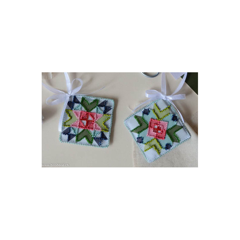 Abris Art, kit perles Decoration spring kaleïidoscope (art. AABT-047). Dimensions: 6.6 x 6.6 cm. Suspenses en perles à coudre sur un tissu coloré.Attention, ce n'est pas du point de croix comptés.Matériel pour les deux décorations.