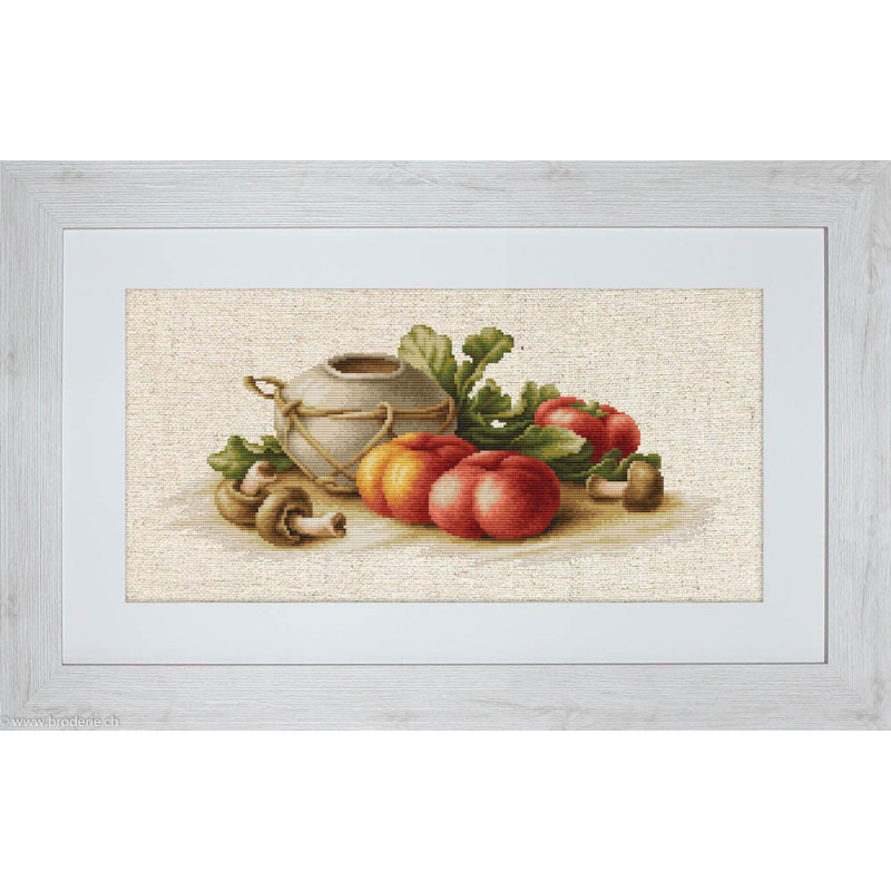 L'article 'Luca-S, kit Still Life with Vegetables (LUCABL2249)' fait partie de notre assortiment depuis le 25 août 2018. Luca-S est une gamme de points de croix comptés qui nous vient de Moldavie. Il y a beaucoup de modèles de personnages, paysages, nature morte, ainsi que de sympathiques kits pour Noël, des sacs à confectionner, des carttes postales à broder. Pour beaucoup de modèle vous pouvez aussi avoir le kit en canevas 25ct, pour des demi-points à compter (10/cm), ce qui fait la broderie bien plus petite et fine dans la rubrique Kits - Luca-S (P). Les kits sont fournis principalement sur de la trame aïda 6.4 points/cm ou 7 points/cm, ou de l'étamine de Zweigart, les coussins avec de l'étamine 8 fils ou 10 fils/cm. Les fils sont de la maison Anchor.