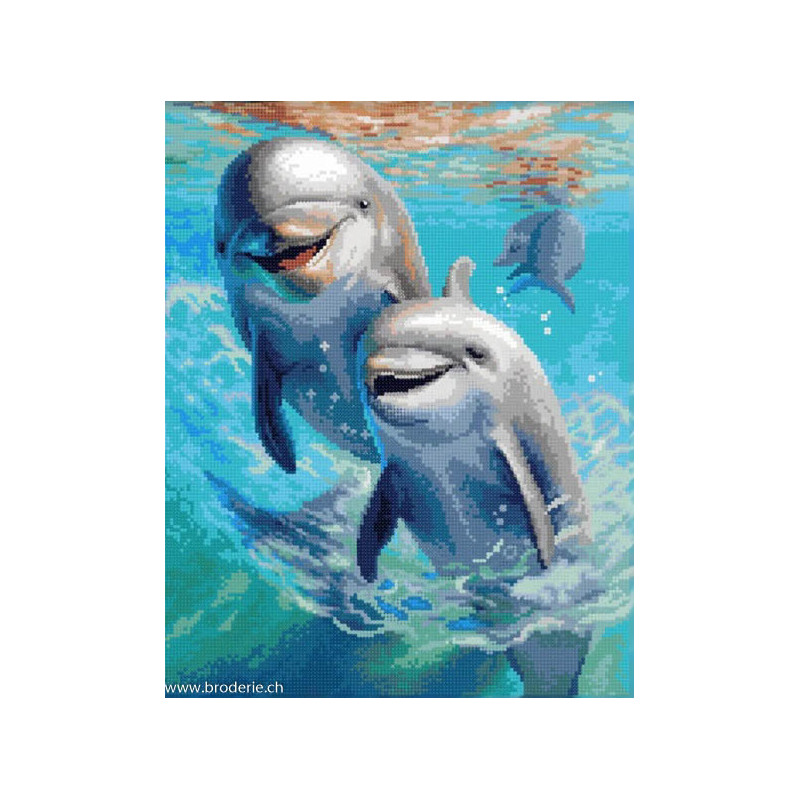 ArtCity, kit diamant Dolphins (art. ACVA805). Dimensions: 30 x 40 cm. Kit Diamant comprenant la toile adhésive imprimée à recouvrir de strass, les sachets de strass 'diamants' ronds triés par couleurs, un stylet et sa cire, un réceptacle et les explications.La toile est déjà tendue sur cadre et est entièrement à recouvrir de strass.ATTENTION, ce n'est pas une broderie, pas de fil ni d'aiguille, mais une mosaïque.