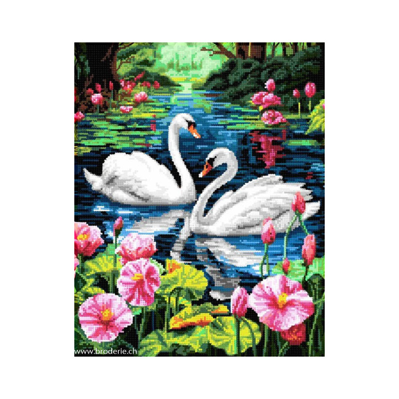 ArtCity, kit diamant Swans (art. ACVA809). Dimensions: 30 x 40 cm. Kit Diamant comprenant la toile adhésive imprimée à recouvrir de strass, les sachets de strass 'diamants' ronds triés par couleurs, un stylet et sa cire, un réceptacle et les explications.La toile est déjà tendue sur cadre et est entièrement à recouvrir de strass.ATTENTION, ce n'est pas une broderie, pas de fil ni d'aiguille, mais une mosaïque.