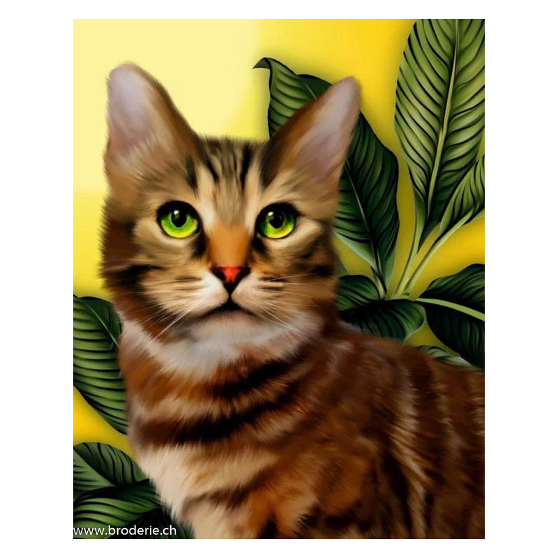 ArtCity, kit diamant Green-eyed kitten (art. ACDP022). Dimensions: 40 x 50 cm. Kit Diamant comprenant la toile adhésive imprimée à recouvrir de strass, les sachets de strass 'diamants' ronds triés par couleurs, un stylet et sa cire, un réceptacle et les explications.La toile est déjà tendue sur cadre et est entièrement à recouvrir de strass.ATTENTION, ce n'est pas une broderie, pas de fil ni d'aiguille, mais une mosaïque.
