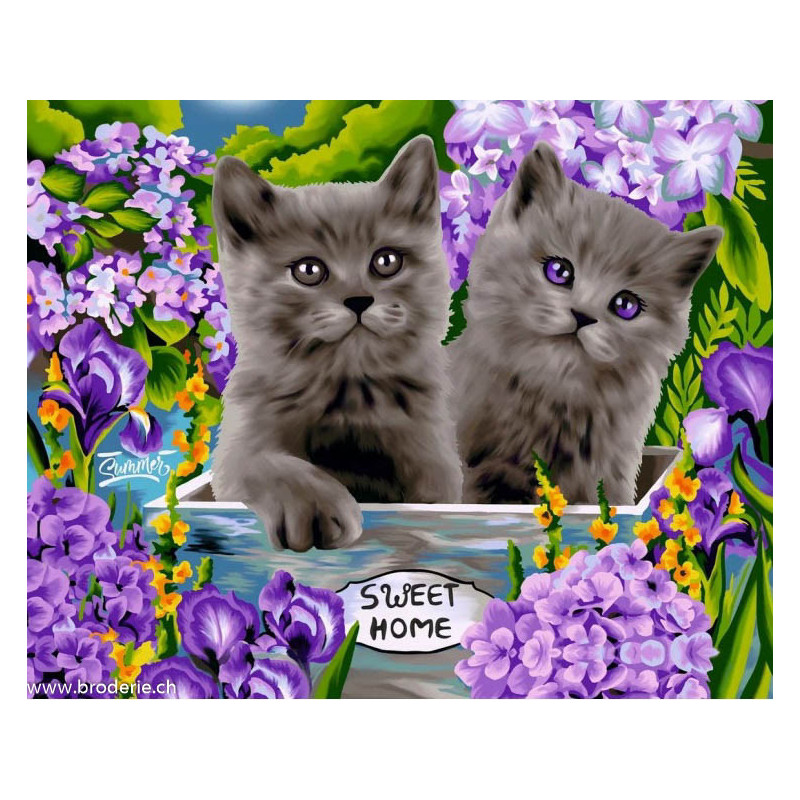 ArtCity, kit diamant British kittens (art. ACDP045). Dimensions: 50 x 40 cm. Kit Diamant comprenant la toile adhésive imprimée à recouvrir de strass, les sachets de strass 'diamants' ronds triés par couleurs, un stylet et sa cire, un réceptacle et les explications.La toile est déjà tendue sur cadre et est entièrement à recouvrir de strass.ATTENTION, ce n'est pas une broderie, pas de fil ni d'aiguille, mais une mosaïque.