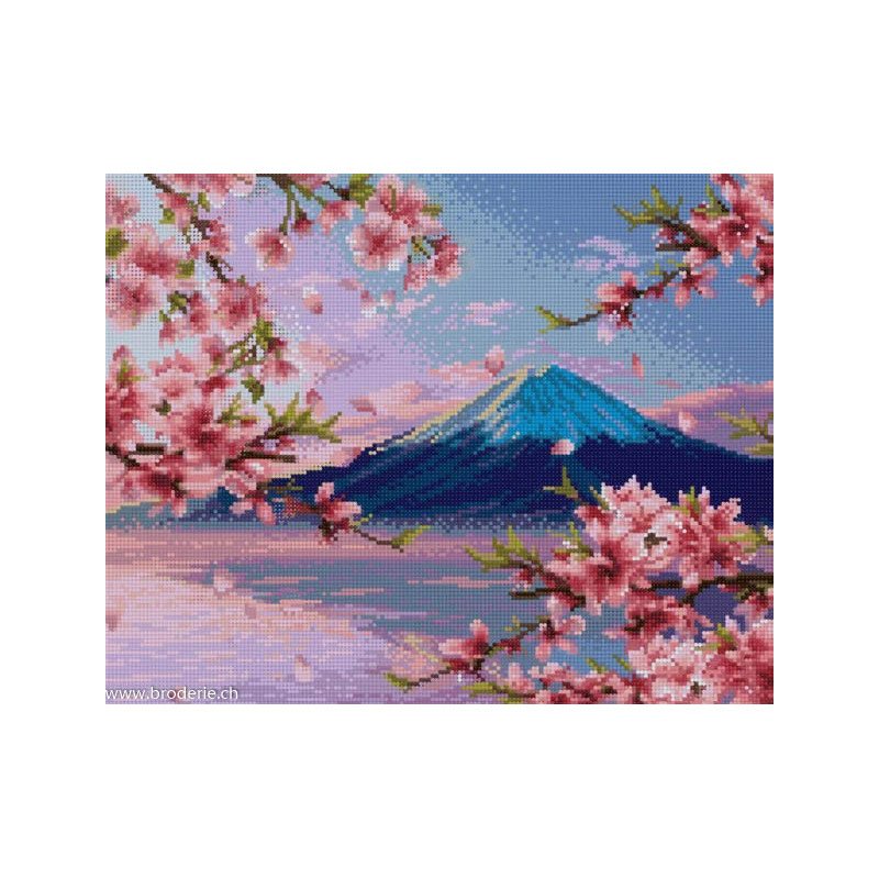 ArtCity, kit diamant Mont Fuji (art. ACVA801). Dimensions: 40 x 30 cm. Kit Diamant comprenant la toile adhésive imprimée à recouvrir de strass, les sachets de strass 'diamants' ronds triés par couleurs, un stylet et sa cire, un réceptacle et les explications.La toile est déjà tendue sur cadre et est entièrement à recouvrir de strass.ATTENTION, ce n'est pas une broderie, pas de fil ni d'aiguille, mais une mosaïque.