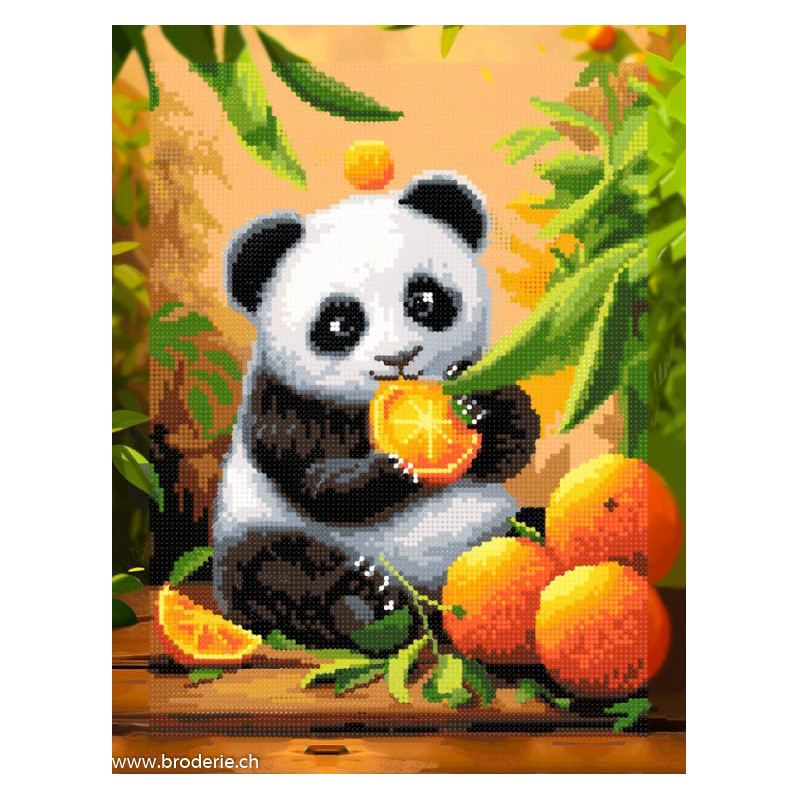ArtCity, kit diamant Panda with oranges (art. ACVA825). Dimensions: 30 x 40 cm. Kit Diamant comprenant la toile adhésive imprimée à recouvrir de strass, les sachets de strass 'diamants' ronds triés par couleurs, un stylet et sa cire, un réceptacle et les explications.La toile est déjà tendue sur cadre et est entièrement à recouvrir de strass.ATTENTION, ce n'est pas une broderie, pas de fil ni d'aiguille, mais une mosaïque.