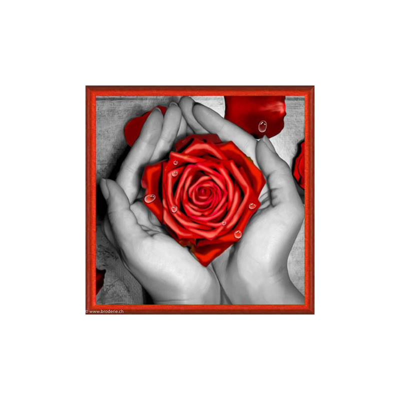 Artibalta, kit diamant Rose in Hands (art. AZ-1775). Dimensions: 25 x 25 cm. Kit comprenant la toile adhésive, les strass carrés emballés dans des sachets individuels et numérotés aux références des coloris de DMC, une pince, un stylo et sa colle, 2 réceptables et les explications.Toute la surface du tableau est à recouvrir de strass. ATTENTION: ce n'est pas une broderie, il n'y a ni fil ni aiguille, mais un collage comme une mosaïque.Dans la même série 1772 à 1776.