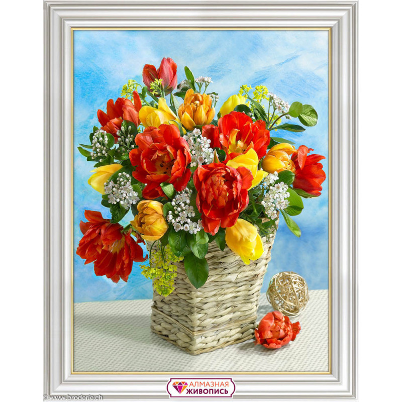 Artibalta, kit diamant paniers et tulipes (art. AZ-1877). Dimensions: 30 x 40 cm. Kit complet de Broderie Diamant comprenant la toile adhésive imprimée à recouvrir de strass, les sachets de strass 'diamants' triés par couleurs, un stylet et sa cire, un réceptacle et les explications. La totalité de la surface est à recouvrir. ATTENTION, ce n'est pas une broderie, pas de fil ni d'aiguille, mais une mosaïque.