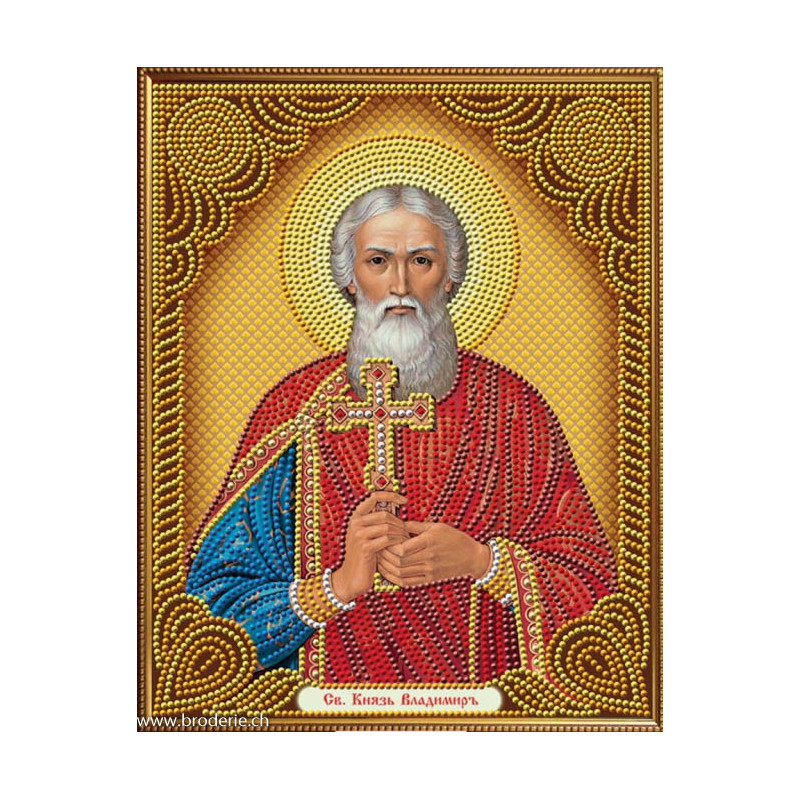 Artibalta, kit diamant Icon of Prince Vladimir (art. AZ-5025). Dimensions: 22 x 28 cm. Kit comprenant la toile adhésive, les strass carrés emballés dans des sachets individuels et numérotés aux références des coloris de DMC, une pince, un stylo et sa colle, 2 réceptables et les explications.La surface n'est pas toute recouverte.ATTENTION: ce n'est pas une broderie, il n'y a ni fil ni aiguille, mais un collage comme une mosaïque.