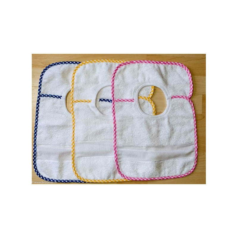 La Chiocciolina, Bavoir avec velcro bord vichy Rose (art. BV00127Rose). Dimensions: 28 x 25 cm. En éponge, avec bande à broder aïda 6 points/cm de 30 points de haut, à droite sur la photo.