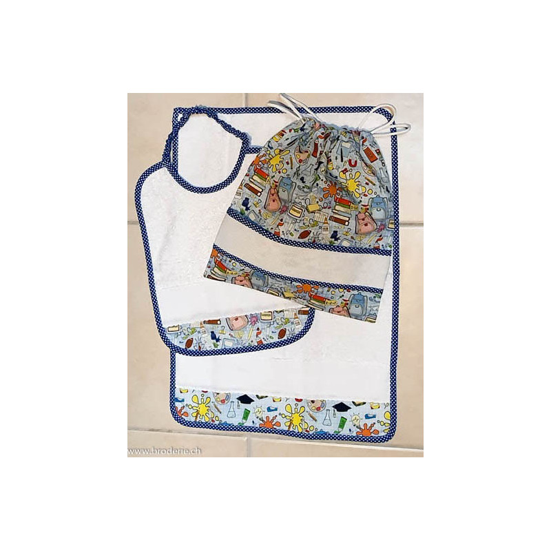 La Chiocciolina, linge éponge école (art. SA00805.53). Dimensions: 35 x 50 cm. En bas sur la photo. Linge éponge 100% coton avec une bande à broder de 5cm de large. Bavoir assorti sous réf BV01071 et sac sous réf SA805.16, jusqu'à épuisement du stock.