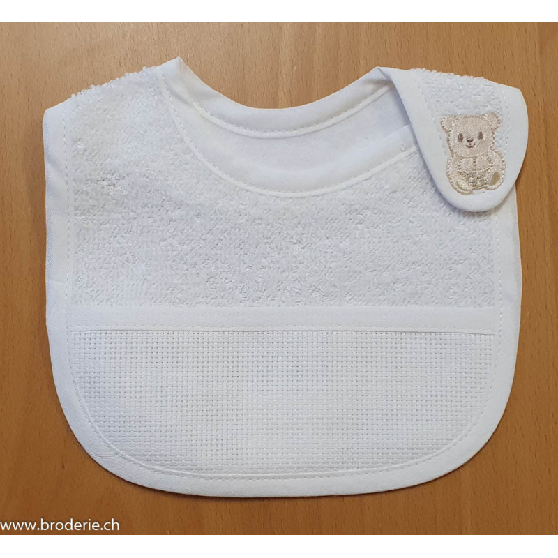 La Chiocciolina, bavoir 1er âge avec petit ourson, écru (art. BV1047). Petite attache velcro sur le côté, format du bavoir de 17 cm sur 15 avec une bande à broder 5.4 points/cm, fond blanc.