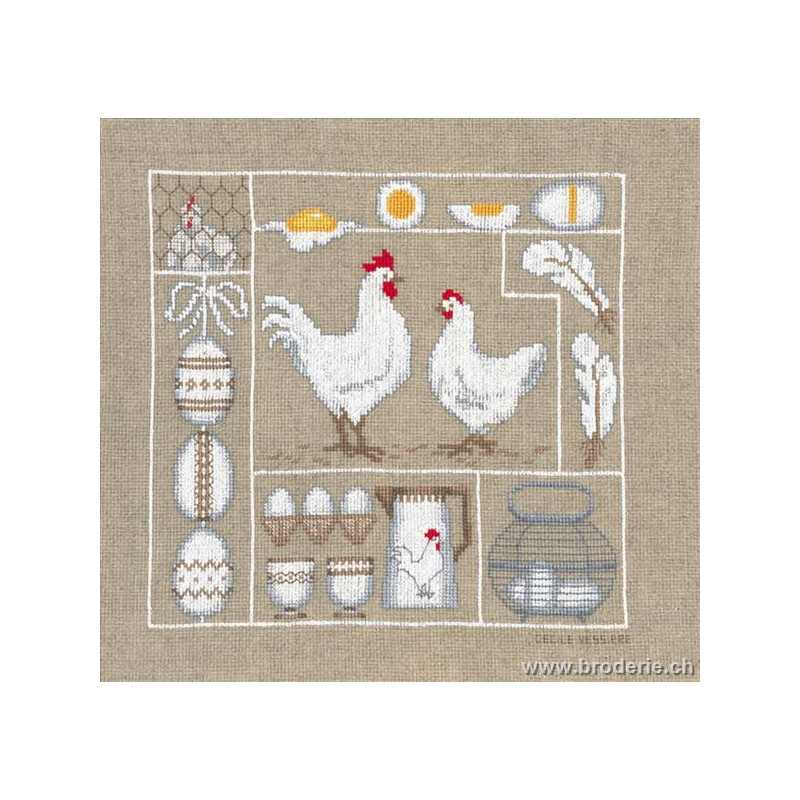 L'article 'Bonheur des Dames, kit poules et œufs (BD1055)' fait partie de notre assortiment depuis le 18 novembre 2006. La gamme française Bonheur des Dames est très complète et propose de très jolis modèles de kits de point-de croix comptés. Sont très représentés les thèmes de la mer, des mois et saisons,la cuisine et les enfants. Pour l'instant nous avons mis sur le site les kits, mais le Bonheur des Dames propose aussi des accessoires tels que coeur en lin, bottes de Noël en feutrine prêts à être broder, modèles de points de croix. Vous pouvez nous contacter pour ces articles que nous tenons aussi en partie en stock. Fiche technique: kits très bien présentés, souvent avec les accessoires fournis. Mais attention, les kits peuvent avoir différents points et parfois des petits-points (tout le kit -ex BD3646 - ou une partie - ex BD1135), merci d'y prendre garde lors de votre commande.