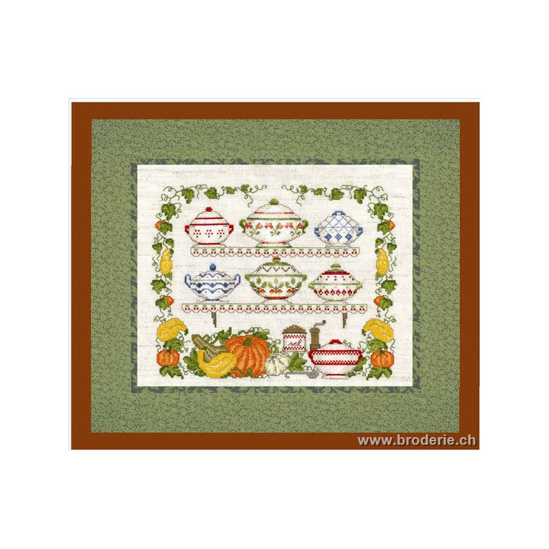 L'article 'Bonheur des Dames, kit la soupière (BD1026)' fait partie de notre assortiment depuis le 9 juillet 2008. La gamme française Bonheur des Dames est très complète et propose de très jolis modèles de kits de point-de croix comptés. Sont très représentés les thèmes de la mer, des mois et saisons,la cuisine et les enfants. Pour l'instant nous avons mis sur le site les kits, mais le Bonheur des Dames propose aussi des accessoires tels que coeur en lin, bottes de Noël en feutrine prêts à être broder, modèles de points de croix. Vous pouvez nous contacter pour ces articles que nous tenons aussi en partie en stock. Fiche technique: kits très bien présentés, souvent avec les accessoires fournis. Mais attention, les kits peuvent avoir différents points et parfois des petits-points (tout le kit -ex BD3646 - ou une partie - ex BD1135), merci d'y prendre garde lors de votre commande.