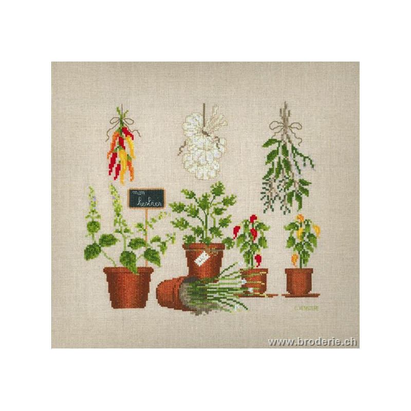 L'article 'Bonheur des Dames, kit aromates (BD1084)' fait partie de notre assortiment depuis le 9 juillet 2008. La gamme française Bonheur des Dames est très complète et propose de très jolis modèles de kits de point-de croix comptés. Sont très représentés les thèmes de la mer, des mois et saisons,la cuisine et les enfants. Pour l'instant nous avons mis sur le site les kits, mais le Bonheur des Dames propose aussi des accessoires tels que coeur en lin, bottes de Noël en feutrine prêts à être broder, modèles de points de croix. Vous pouvez nous contacter pour ces articles que nous tenons aussi en partie en stock. Fiche technique: kits très bien présentés, souvent avec les accessoires fournis. Mais attention, les kits peuvent avoir différents points et parfois des petits-points (tout le kit -ex BD3646 - ou une partie - ex BD1135), merci d'y prendre garde lors de votre commande.