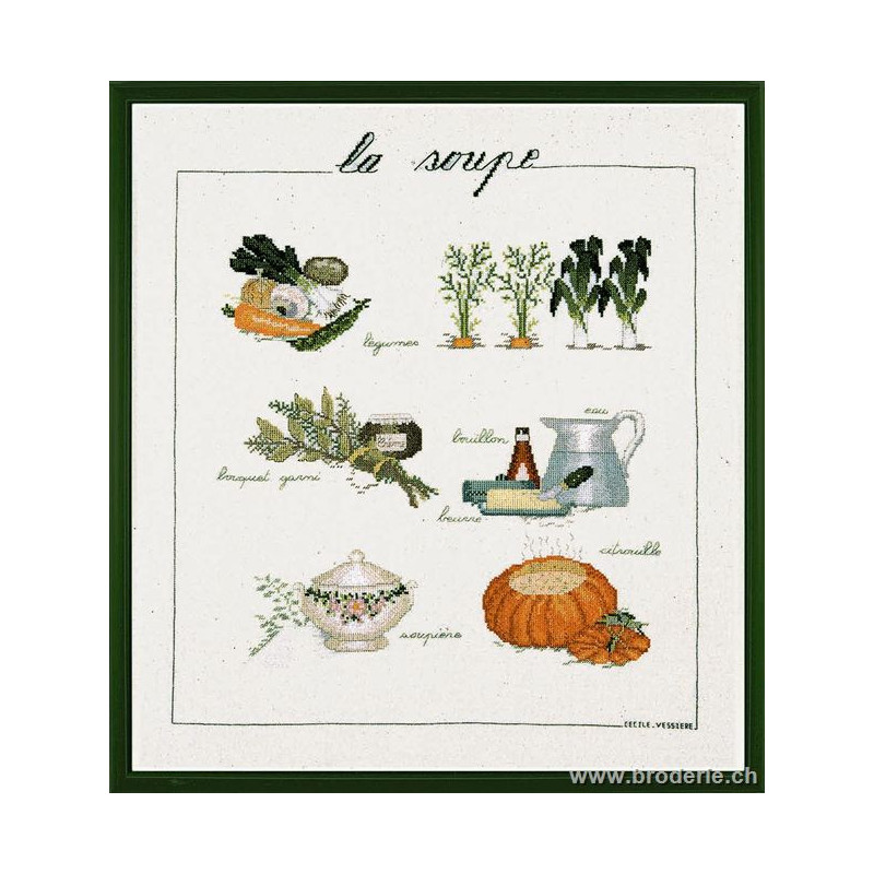 L'article 'Bonheur des Dames, kit la soupe (BD1180)' fait partie de notre assortiment depuis le 9 juillet 2008. La gamme française Bonheur des Dames est très complète et propose de très jolis modèles de kits de point-de croix comptés. Sont très représentés les thèmes de la mer, des mois et saisons,la cuisine et les enfants. Pour l'instant nous avons mis sur le site les kits, mais le Bonheur des Dames propose aussi des accessoires tels que coeur en lin, bottes de Noël en feutrine prêts à être broder, modèles de points de croix. Vous pouvez nous contacter pour ces articles que nous tenons aussi en partie en stock. Fiche technique: kits très bien présentés, souvent avec les accessoires fournis. Mais attention, les kits peuvent avoir différents points et parfois des petits-points (tout le kit -ex BD3646 - ou une partie - ex BD1135), merci d'y prendre garde lors de votre commande.