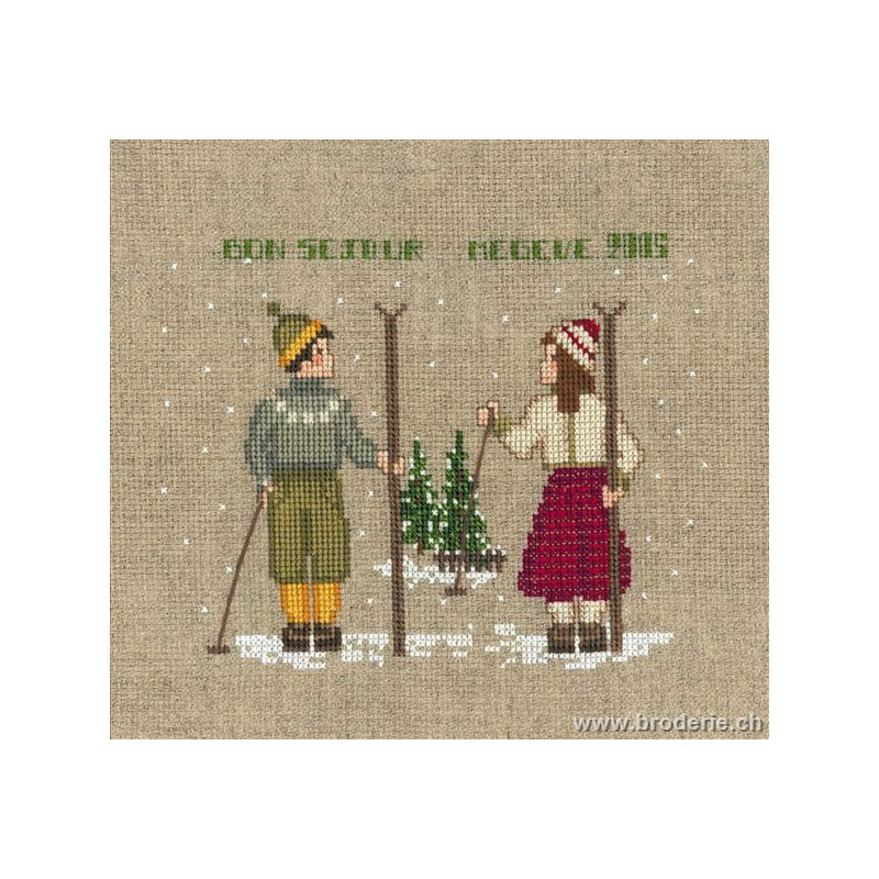 Bonheur des Dames, kit deux skieurs (art. BD2328). Dimensions: 12 x 15 cm. Trame: Aïda 5.5 pts. Points utilisés: point de croix, point de piqûre. Aïda de lin.