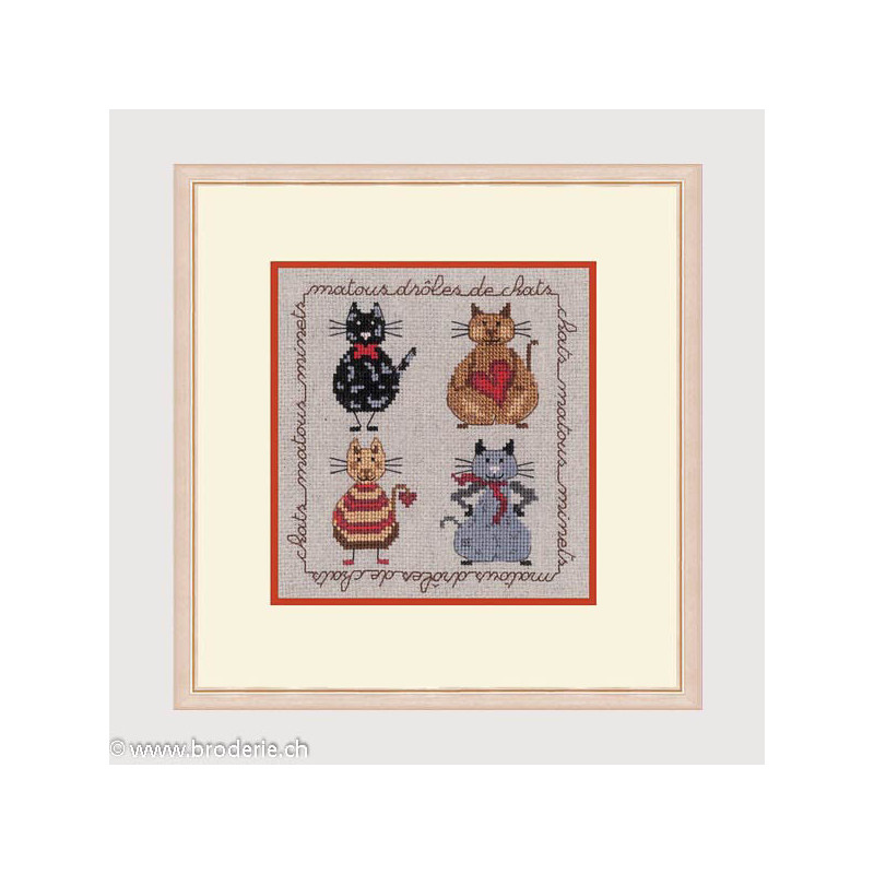 L'article 'Bonheur des Dames, kit 4 matous (BD2271)' fait partie de notre assortiment depuis le 3 avril 2015. La gamme française Bonheur des Dames est très complète et propose de très jolis modèles de kits de point-de croix comptés. Sont très représentés les thèmes de la mer, des mois et saisons,la cuisine et les enfants. Pour l'instant nous avons mis sur le site les kits, mais le Bonheur des Dames propose aussi des accessoires tels que coeur en lin, bottes de Noël en feutrine prêts à être broder, modèles de points de croix. Vous pouvez nous contacter pour ces articles que nous tenons aussi en partie en stock. Fiche technique: kits très bien présentés, souvent avec les accessoires fournis. Mais attention, les kits peuvent avoir différents points et parfois des petits-points (tout le kit -ex BD3646 - ou une partie - ex BD1135), merci d'y prendre garde lors de votre commande.