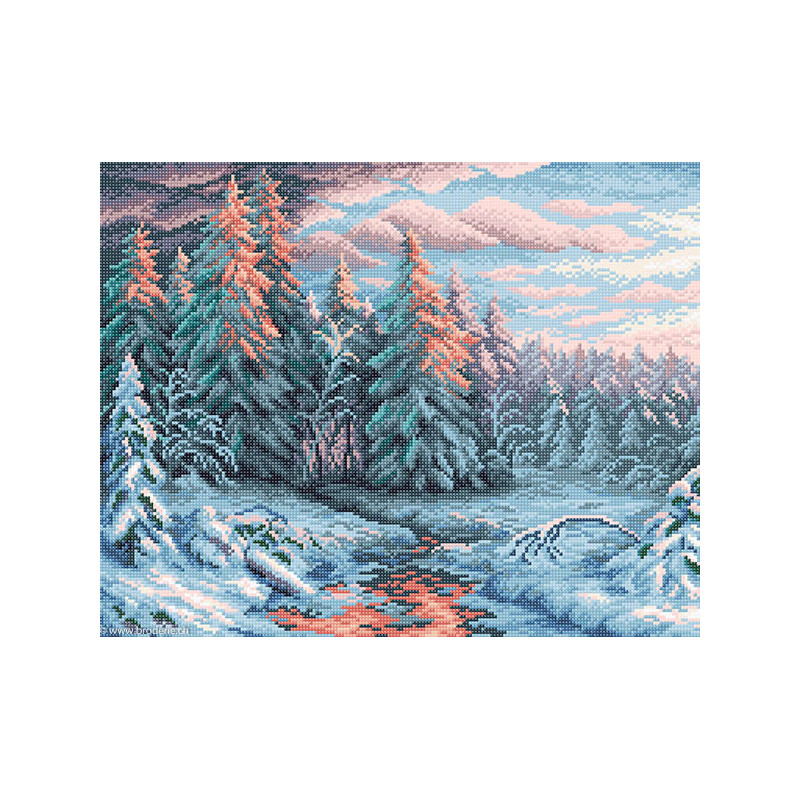 BrilliArt, kit diamant Winter sunset (art. MC-004). Dimensions: 48 x 38 cm. Kit comprenant la toile adhésive, les strass carrés emballés dans des sachets individuels et numérotés aux références des coloris de DMC, une pince, un stylo et sa colle, 2 réceptables et les explications.Toute la surface du tableau est à recouvrir de strass. ATTENTION: ce n'est pas une broderie, il n'y a ni fil ni aiguille, mais un collage comme une mosaïque.