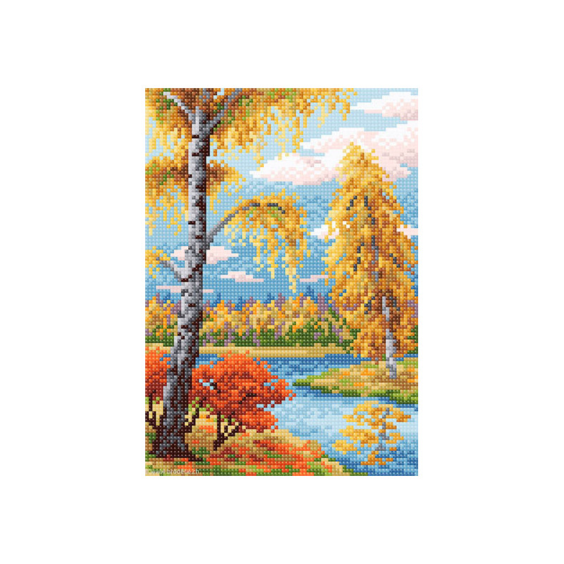 BrilliArt, kit diamant Fall landscape (art. MC-010). Dimensions: 19 x 27 cm. Kit comprenant la toile adhésive, les strass carrés emballés dans des sachets individuels et numérotés aux références des coloris de DMC, une pince, un stylo et sa colle, 2 réceptables et les explications.Toute la surface du tableau est à recouvrir de strass. ATTENTION: ce n'est pas une broderie, il n'y a ni fil ni aiguille, mais un collage comme une mosaïque.