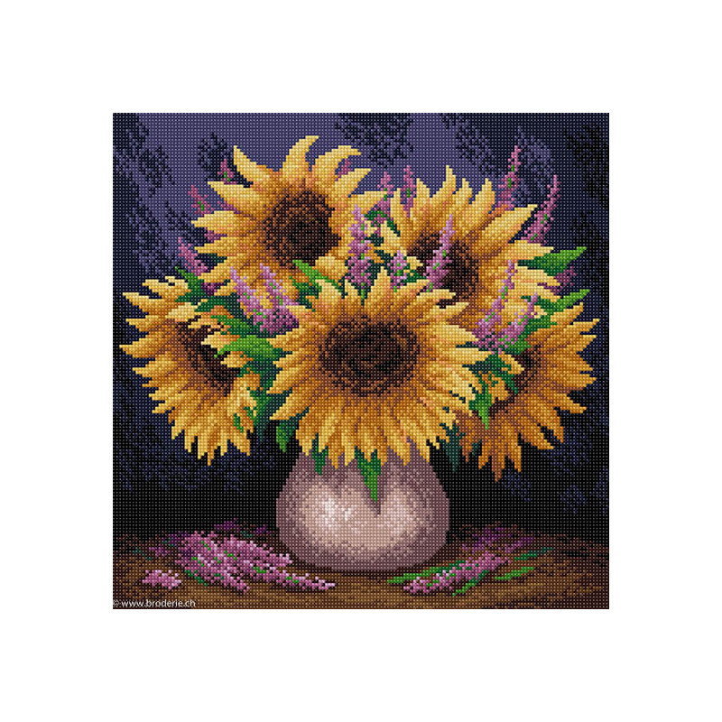 BrilliArt, kit diamant Sunflower mood (art. MC-014). Dimensions: 38 x 38 cm. Kit comprenant la toile adhésive, les strass carrés emballés dans des sachets individuels et numérotés aux références des coloris de DMC, une pince, un stylo et sa colle, 2 réceptables et les explications.Toute la surface du tableau est à recouvrir de strass. ATTENTION: ce n'est pas une broderie, il n'y a ni fil ni aiguille, mais un collage comme une mosaïque.