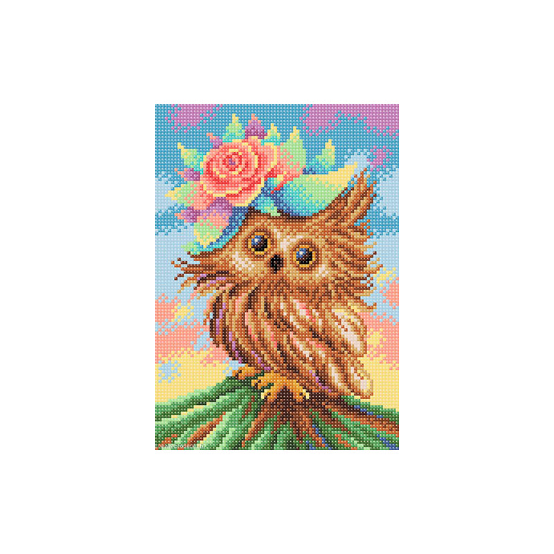 BrilliArt, kit diamant Charming owl (art. MC-030). Dimensions: 19 x 27 cm. Kit comprenant la toile adhésive, les strass carrés emballés dans des sachets individuels et numérotés aux références des coloris de DMC, une pince, un stylo et sa colle, 2 réceptables et les explications.Toute la surface du tableau est à recouvrir de strass. ATTENTION: ce n'est pas une broderie, il n'y a ni fil ni aiguille, mais un collage comme une mosaïque.