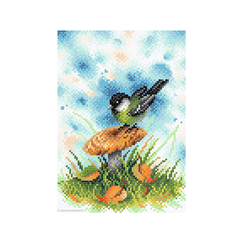 BrilliArt, kit diamant On the mushroom woodside (art. MC-036). Dimensions: 19 x 27 cm. Kit comprenant la toile adhésive, les strass carrés emballés dans des sachets individuels et numérotés aux références des coloris de DMC, une pince, un stylo et sa colle, 2 réceptables et les explications.Toute la surface du tableau est à recouvrir de strass. ATTENTION: ce n'est pas une broderie, il n'y a ni fil ni aiguille, mais un collage comme une mosaïque.