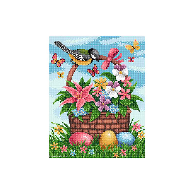BrilliArt, kit diamant Easter gifts (art. MC-041). Dimensions: 38 x 48 cm. Kit comprenant la toile adhésive, les strass carrés emballés dans des sachets individuels et numérotés aux références des coloris de DMC, une pince, un stylo et sa colle, 2 réceptables et les explications.Toute la surface du tableau est à recouvrir de strass. ATTENTION: ce n'est pas une broderie, il n'y a ni fil ni aiguille, mais un collage comme une mosaïque.