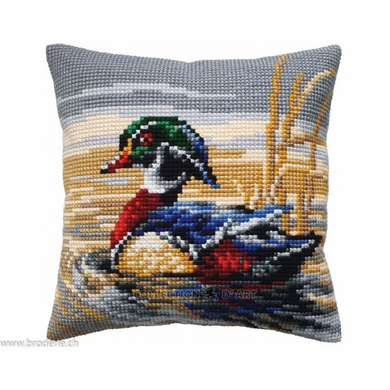 Collection d'Art, kit coussin Mandarin drake (art. CADE5447). Dimensions: 40 x 40 cm. Canevas peint 1,8 croix/cm, le fond n' est pas fourni pour le montage.Toute la collection n'est pas mise sur le site, vous trouvez d'autres articles sous https://collectiondart.eu/products/cushion-kits/.