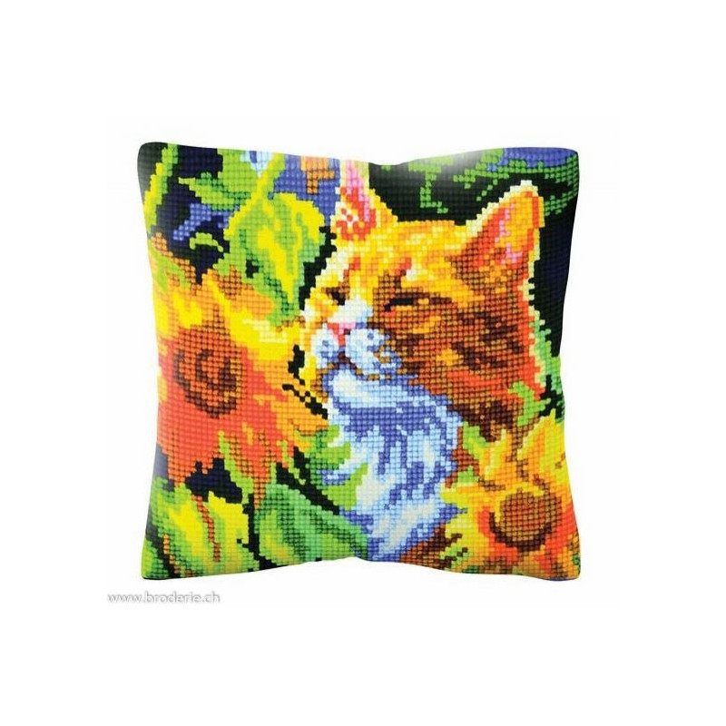 Collection d'Art, kit coussin Cat in sunflowers (art. CADE5502). Dimensions: 40 x 40 cm. Canevas peint 1,8 croix/cm, le fond n' est pas fourni pour le montage.Toute la collection n'est pas mise sur le site, vous trouvez d'autres articles sous https://collectiondart.eu/products/cushion-kits/.