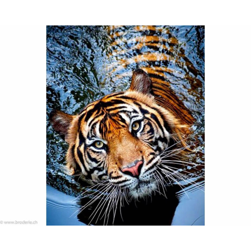 Collection d'Art, kit diamant Tiger (art. CADE239). Dimensions: 38 x 48 cm. Kit comprenant la toile adhésive, les strass carrés emballés dans des sachets individuels et numérotés aux références des coloris de DMC, une pince, un stylo et sa colle, 2 réceptables et les explications.Toute la surface du tableau est à recouvrir de strass. ATTENTION: ce n'est pas une broderie, il n'y a ni fil ni aiguille, mais un collage comme une mosaïque.