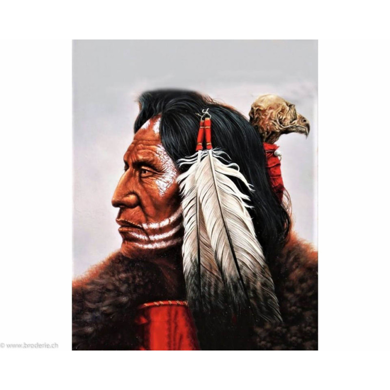 Collection d'Art, kit diamant The cacique (art. CADE064). Dimensions: 38 x 48 cm. Kit comprenant la toile adhésive, les strass carrés emballés dans des sachets individuels et numérotés aux références des coloris de DMC, une pince, un stylo et sa colle, 2 réceptables et les explications.Toute la surface du tableau est à recouvrir de strass. ATTENTION: ce n'est pas une broderie, il n'y a ni fil ni aiguille, mais un collage comme une mosaïque.