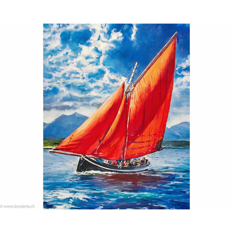 Collection d'Art, kit diamant Red Sails (art. CADE6052). Dimensions: 38 x 48 cm. Kit comprenant la toile adhésive, les strass carrés emballés dans des sachets individuels et numérotés aux références des coloris de DMC, une pince, un stylo et sa colle, 2 réceptables et les explications.Toute la surface du tableau est à recouvrir de strass. ATTENTION: ce n'est pas une broderie, il n'y a ni fil ni aiguille, mais un collage comme une mosaïque.