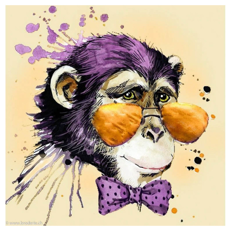 Collection d'Art, kit diamant Mr Monkey (art. CADE7006). Dimensions: 38 x 38 cm. Kit comprenant la toile adhésive, les strass carrés emballés dans des sachets individuels et numérotés aux références des coloris de DMC, une pince, un stylo et sa colle, 2 réceptables et les explications.Toute la surface du tableau est à recouvrir de strass. ATTENTION: ce n'est pas une broderie, il n'y a ni fil ni aiguille, mais un collage comme une mosaïque.