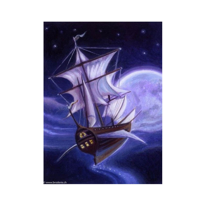 Collection d'Art, kit diamant Ghost ship (art. CADE7058). Dimensions: 19 x 27 cm. Kit comprenant la toile adhésive, les strass carrés emballés dans des sachets individuels et numérotés aux références des coloris de DMC, une pince, un stylo et sa colle, 2 réceptables et les explications.Toute la surface du tableau est à recouvrir de strass. ATTENTION: ce n'est pas une broderie, il n'y a ni fil ni aiguille, mais un collage comme une mosaïque.