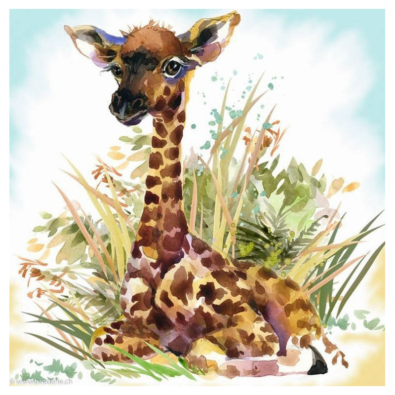 Collection d'Art, kit diamant Baby giraffe (art. CADE7139). Dimensions: 38 x 38 cm. Kit comprenant la toile adhésive, les strass carrés emballés dans des sachets individuels et numérotés aux références des coloris de DMC, une pince, un stylo et sa colle, 2 réceptables et les explications.Toute la surface du tableau est à recouvrir de strass. ATTENTION: ce n'est pas une broderie, il n'y a ni fil ni aiguille, mais un collage comme une mosaïque.