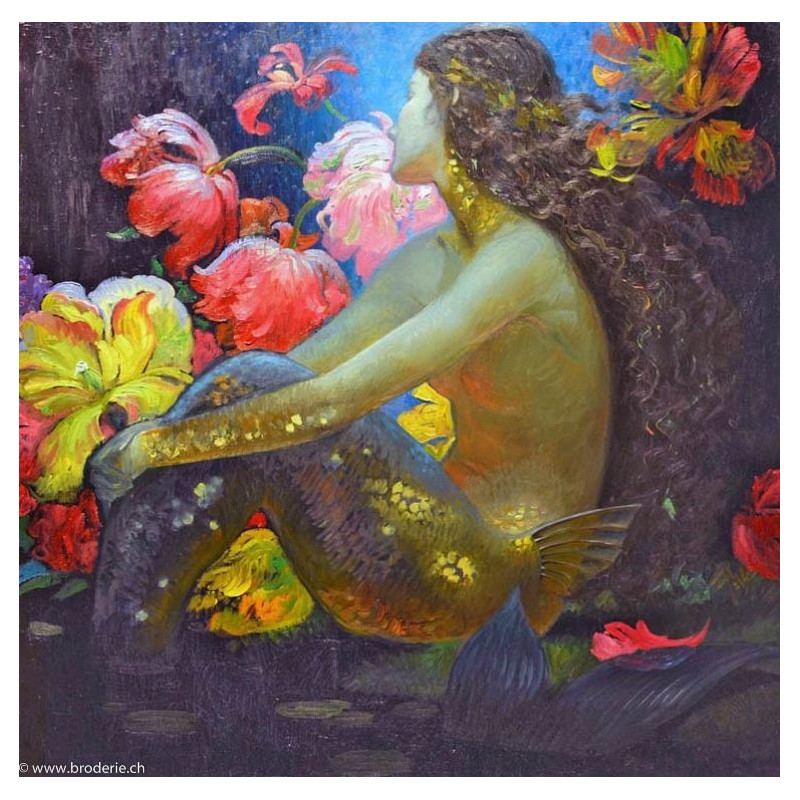 Collection d'Art, kit diamant Magic world. Mermaid (art. CADE7134). Dimensions: 38 x 38 cm. Kit comprenant la toile adhésive, les strass carrés emballés dans des sachets individuels et numérotés aux références des coloris de DMC, une pince, un stylo et sa colle, 2 réceptables et les explications.Toute la surface du tableau est à recouvrir de strass. ATTENTION: ce n'est pas une broderie, il n'y a ni fil ni aiguille, mais un collage comme une mosaïque.