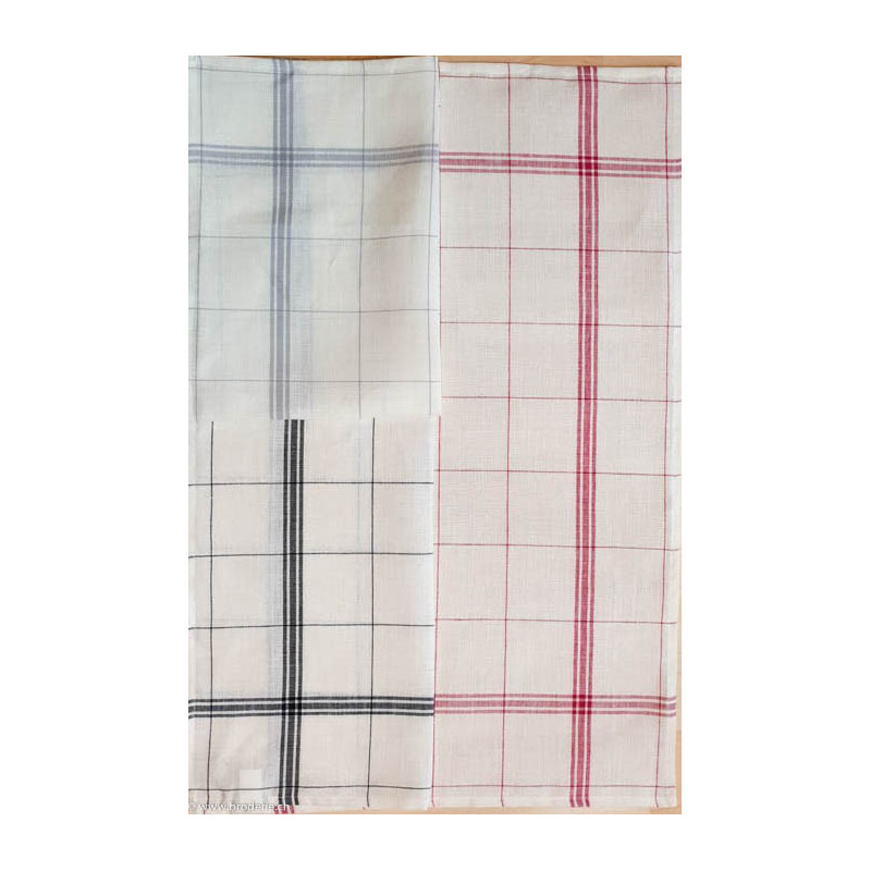 Thieffry Frères, linge de cuisine en lin lignes noires, fond blanchi (art. THLBN). Dimensions: 60 x 75 cm. Linge 100% lin 12 fils/cm. Idées de modèles pour ce linge dans le livre MLAB326 des Edtisons de saxe; grilles d' Isabelle Vautier. En bas à gauche sur la photo.