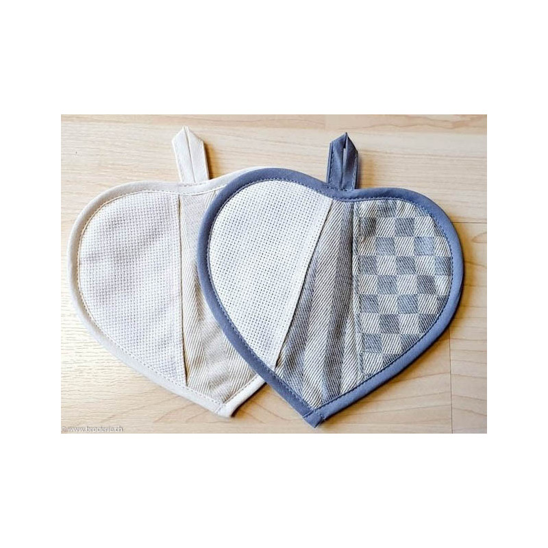 Ricami, petite manique coeur damassé cadrillé écru (art. CU00631.017). Dimensions: 15 x 13 cm. Petit coeur avec deux petites poches dont une à broder, pour enfiller les doigts et plier la manique. Dans cette même gamme d'articles de cuisine, références CU00631. ...90% coton 10% polyester, à gauche sur la photo.