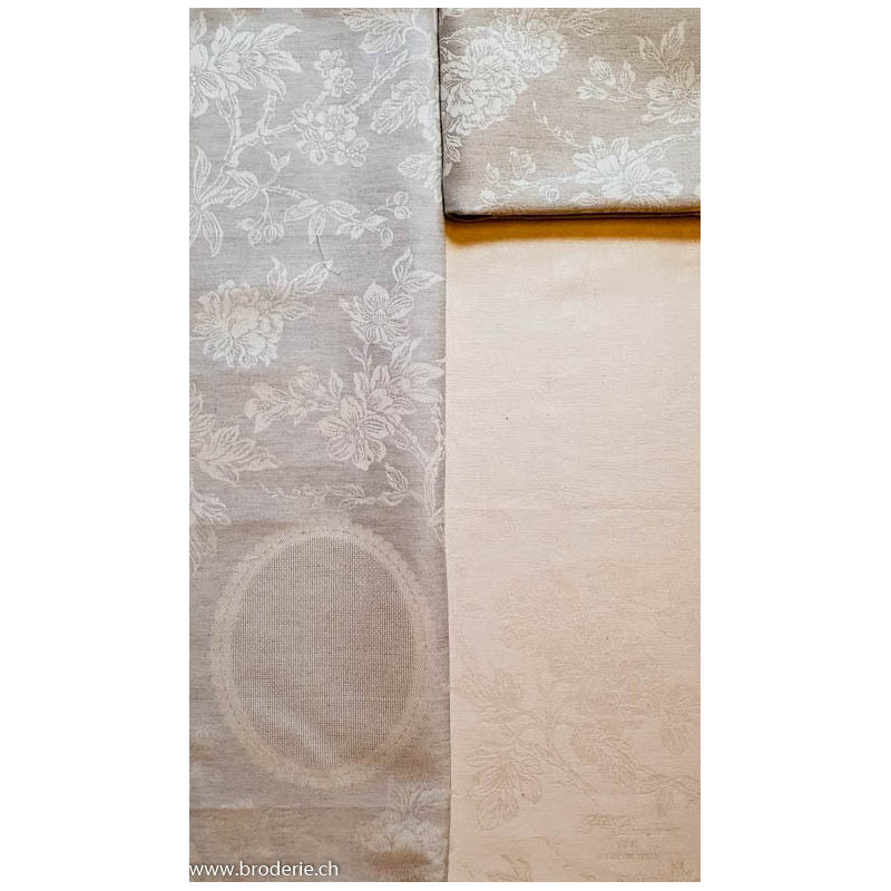 Graziano, linge de cuisine Maison écru beige chiné (art. CU6122). Dimensions: 45 x 70 cm. Linge 100% lin avec un oval à broder 5.5 points/cm de 15 cm sur 19 cm.Coloris DMC correspondant 3782, à droite en haut sur la photo.