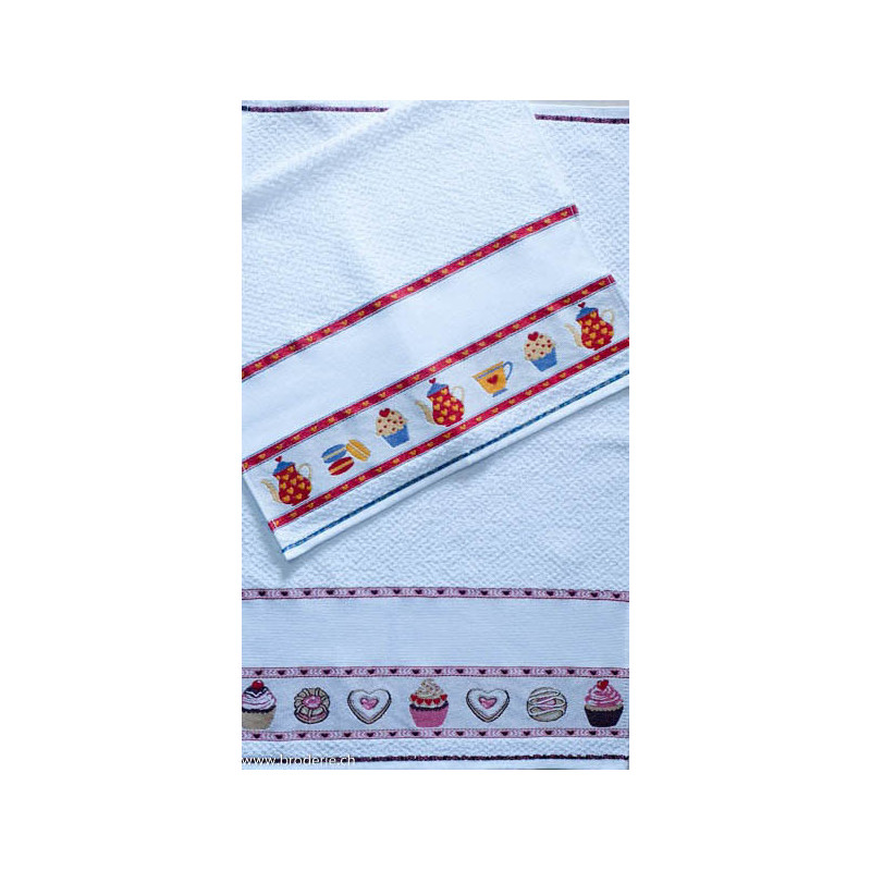 Ricami, Linge éponge blanc avec bordure Cupcakes et biscuits (art. CU00385BIS). Dimensions: 45 x 70 cm. Linge éponge 100% coton, avec une bande à broder aïda 7 points/cm de 40 points de haut, dessous sur la photo.
